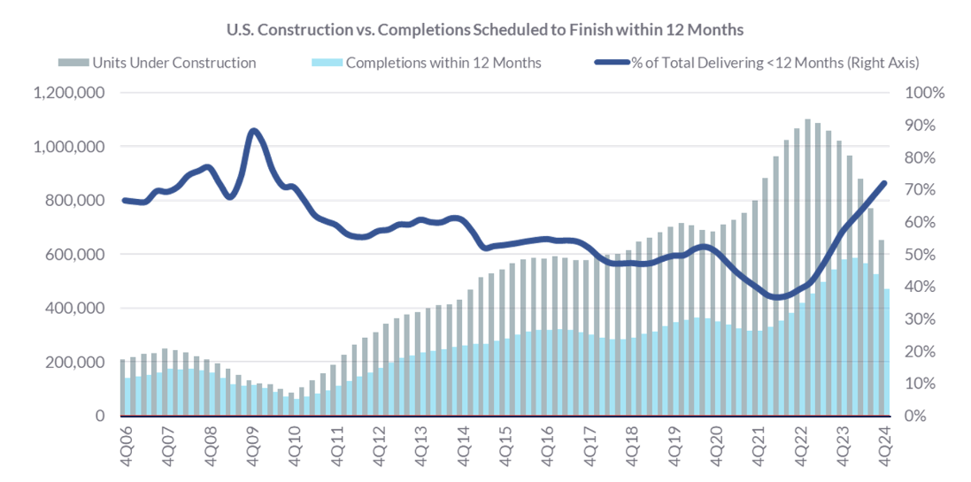 On the supply side, the apartment market is coming off a record-setting year for new deliveries. In 2024, more units were delivered than in any year since the mid-1970s. However, this construction peak is now in the rearview mirror. By 2026, new apartment deliveries are expected to drop to their lowest levels since the mid-2010s.